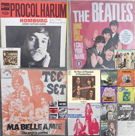 65 behoorlijke -van hoezen voorziene- vinylsingles (met o.a. PROCOL HARUM, JOHN LENNON, THE BEATLES, THE ROLLING STONES, TEE SET, ANDRE BRASSEUR, REDBONE, FLEETWOOD MAC, GEORGIE FAME & ALAN PRICE, TOM JONES, ERIC CLAPTON, SHOCKING BLUE, SIMON & GARFUNKEL, SANTANA, ELVIS PRESLEY, PINK FLOYD, JULIO IGLESIAS, GEORGE BAKER SELECTION, ROD STEWART, e.v.a. ...) met meestal Engelstalige, maar ook met enkele schaars te vinden instrumentale en anderstalige exemplaren.Hoofdzakelijk zelf aangekocht materiaal, steeds voorzien van een hoes.