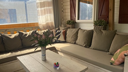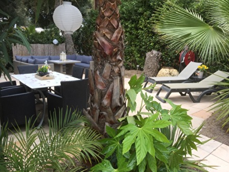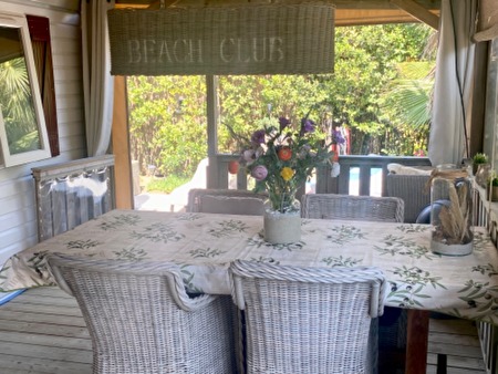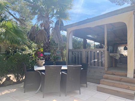 Te huur ons chalet voor 4 a 5 personen op het luxe familiepark La Toison D’Or, Ramatuelle op een mooie locatie.Het chalet heeft een overdekt terras, en ook een groot buitenterras met loungeset en eethoek.