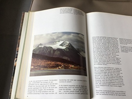 bereiken .Daar in het uiterste noorden van Skandinavië in die verste uithoek van Europa ,leeft over alle kunstmatige ,door de politiek en geschiedenis getrokken grenzen heen,een oud volk,dat probeert te leven volgens eigen aard en ritme ,dat zijn eigenheid en oorspronkelijkheid wenst te behouden zonder daarom de voordelen vann de moderne beschaving te versmaden .Dit volk is het volk van Lapland,de Lappen .De Lappen zijn geen ( brave ) wilden,geen ( goede ) primitieven en al evenmin een folklorische of etnografische kuriositeit ,maar een volk van fiere mensen met de vaste wil te overleven,een volk dat van heel ver komt in de ruimte en de tijd en sinds kort als volk ontwaakt is en vast besloten is zich te handhaven.Het leven in Lapland heeft een zeer speciaal ritme ,opgelegd aan de ene kant door oude regels n gebruiken en aan de andere kant door de zeer speciale aldaar heersende levensomstandigheden .Ook al veranderen die levensomstandigheden en het leefmilieu heden te dage langzaam onder de invloed van de moderne beschaving ,toch is het land niet of nauwelijksveranderd sinds één à twee eeuwen en zelfs meer.De kou en de sneeuw ,de lange zomer en de winternacht , de praal en pracht van het zomerlandschap en de ijzige donkere winter zijn nog steeds dezelfde zoals vroeger .Nog steeds trekken de honderduizenden rendieren door de metelijke toendra ( )en nog steeds zijn de wouden bewoond door de eland ,de beer, de wolf en vos ,ook al zijn deze dieren thans minder talrijk dan eertijds .Het berkenbos is een van de voornaamste elementen in het landschap van het hoge noorden .Vele verschillende bloemen zoals de fraaie steenbreek genaamd ( de Saxifraga Aizoides ) In Finland de moerassen in de zomer de ontelbare wollengraspluizen en de gewone Veenpluis ook ( Eriophorum Angustifolium ) genaamd ook de rondbladige zonnedauw ( Drosera Rotundifolia ) genaamd ook Moerasbraam ( Rubuschamaemorus ) genaamd gefotografeerd tussen Kongs-fjord en Berlevag in Noorwegen en nog zoveel meer en ook rijk aan gevogelte ,ondanks het veelvuldig gebruik van de z.g. sneewscooter in Lapland is het rendier nog steeds onmisbaar om de kudde te leiden en te bewaken en om verdwaalde dieren terug te vinden. Bergen , meren, heiden,moerassen, korstmossen, in alle kleuren , dit zijn elementen van het landschap in Lapland , dat maar weinig verschilt van de ene streek tot de andere .De korstmossen, die de rotsen en bomen tooien met een veelkleurig kleed, zijn een kostbaar geschenk van de natuur ,waarmee de rendieren en talrijke andere dieren zich voeden .De bosbessen ,waarvan de struikjes duizenden vierkante kilometers bekleden , zijn eveneens een rijkdom van Lapland .Het hout is één van de voornaamste natuurlijke hulpbronnen van Lapland .Zee talrijk aldaar zijn de zagerijen voor het zagen van planken,die meestal ter plaatse worden gebruikt als timmer-en konstruktiehout .Editie jaar 1978 met 128 Blz.met prachtige en unieke foto's