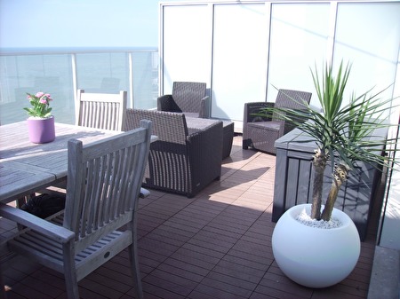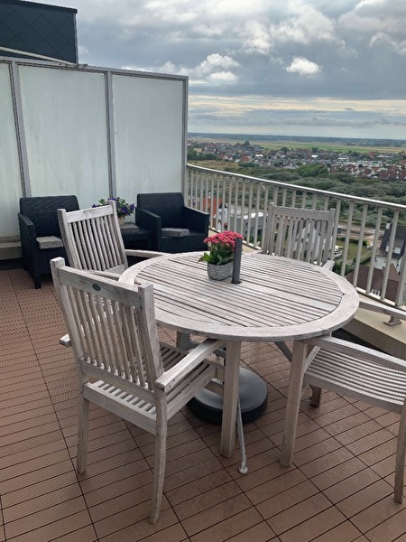 Mooi dakappartement met ruime terrassen, vooraan met zicht op zee en aan de achterzijde een panoramisch zicht op het hinterland.Het is gelegen te 8430 Westende (Middelkerke), Zeedijk 303, residentie Sealand.