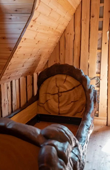 Tweepersoonsbed en 2 enkele bedden, uniek ontwerp: de bedombouw is van boomstronk gemaakt. Volledig uitgeruste keuken met 2 kookplaten en magnetron. Eigen badkamer. Barbecue op het terras.
