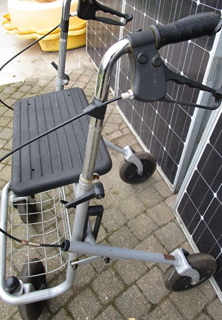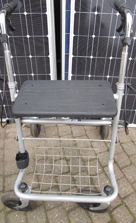rollator, verstelbaar, met 2 handremmen die kunnen geblokkeerd worden om op te zitten, gebruikte maar goede staat