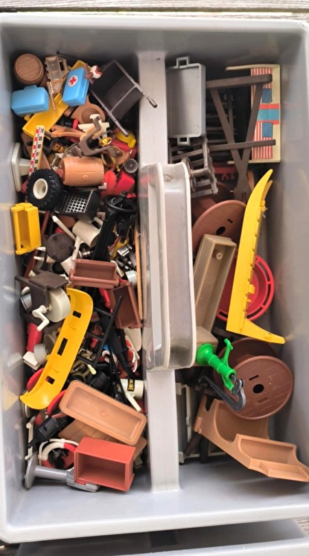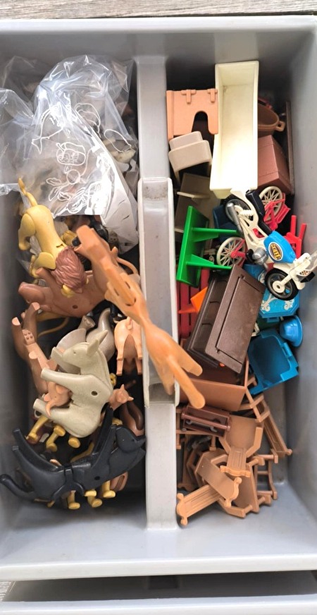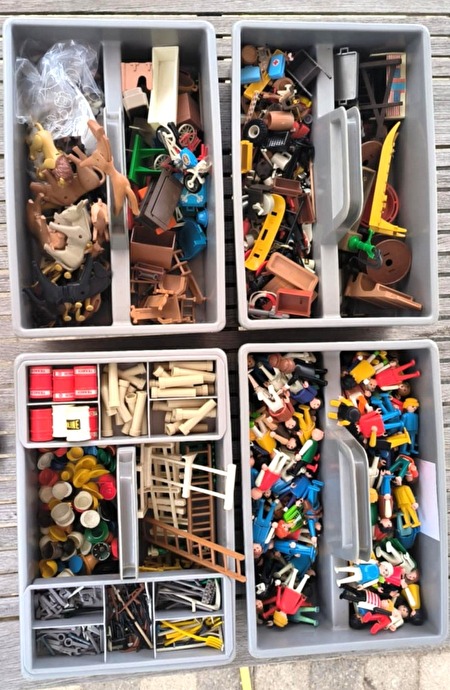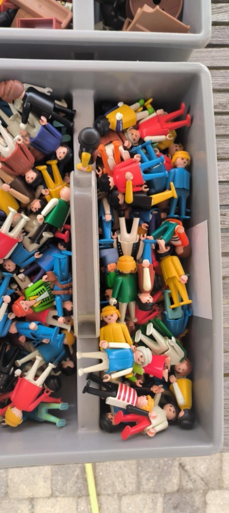 Collectie PLAYMOBIL-figuurtjes (132 stuks), grote dieren (20 stuks), sorteerbakjes (10 stuks), allerlei onderdelen (zie foto's). Alles in degelijke staat en de grijze opbergbakken zijn inbegrepen bij de aankoop. Doe een aannemelijk bod voor het geheel en de collectie is van u!Locatie: Sombeke - Waasmunster