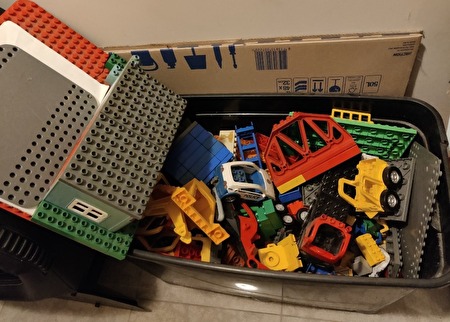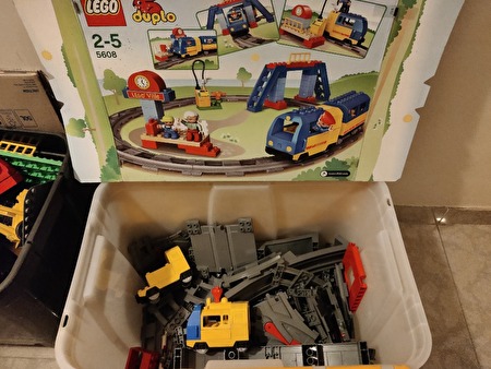 2 bakken met Lego speelgoed waarbij een trein met rails en bruggen. Bevat heel wat dozen Lego. Bakken niet inbegrepen.
