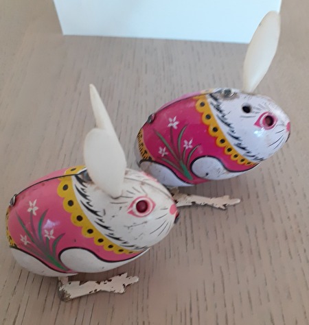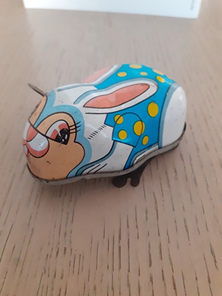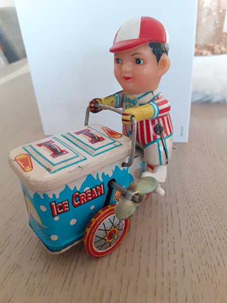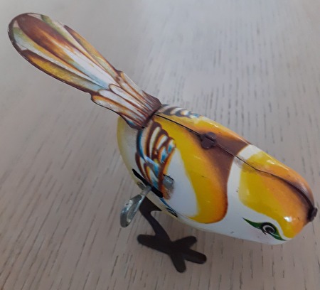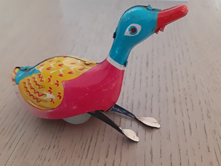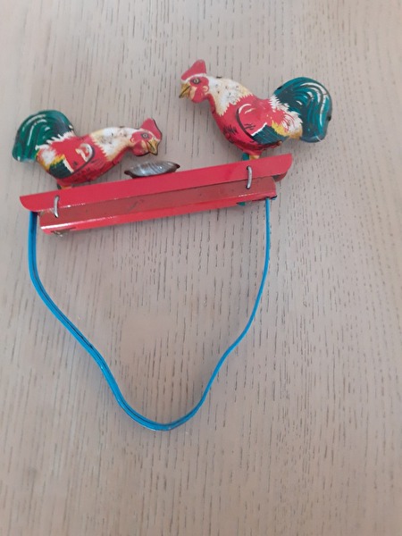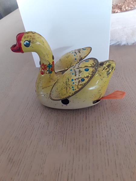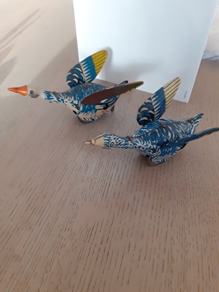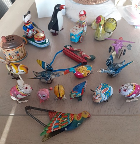blikken speelgoed uit de jaren 50, ijsjeskar-muziektrommel-grote zwaan-kippen formatie-eend-konijntje-kleine vogel-kleine papegaai-konijn-kleine eend-kanarie-vliegtuig-kleine kip-trommelaar-pinguïn-piepende vogel-prijs : 100 €