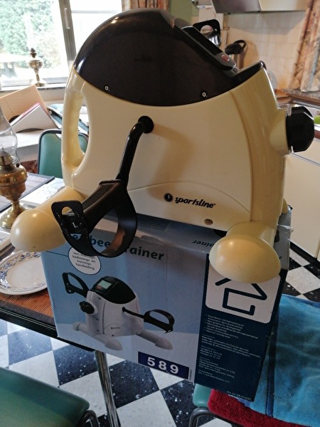 Kleine hometrainer , zowel voor de benen als voor de armen door het ding op een tafel te plaatsen . Zeer weinig gebruikt en dus bijna in nieuwstaat . Regelknop om trapbelasting in te stellen . Display met verscheidene functies