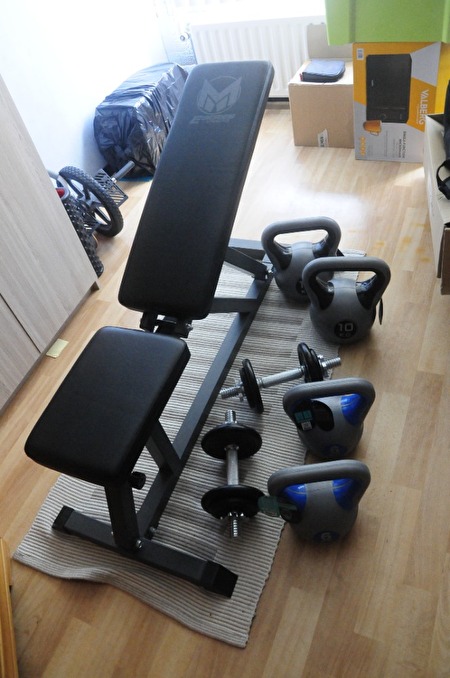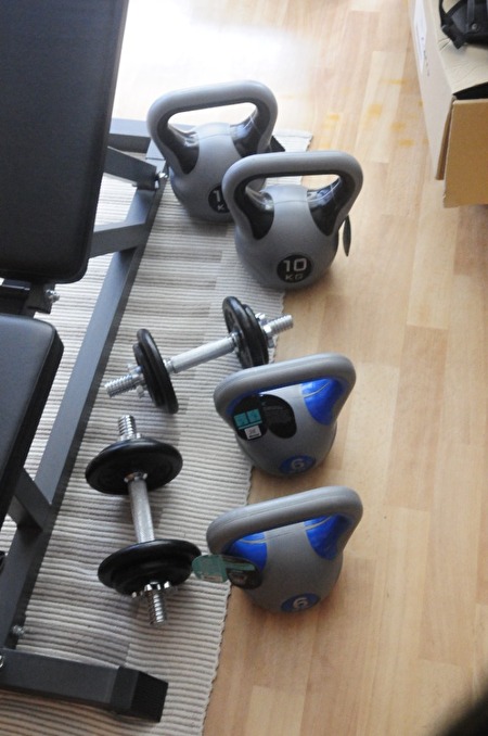 In zeer goede staat, dumbells vier kettlebels 2x10kg en 2x6kg