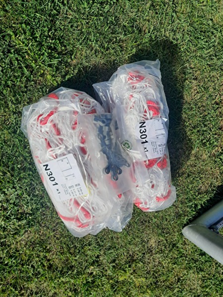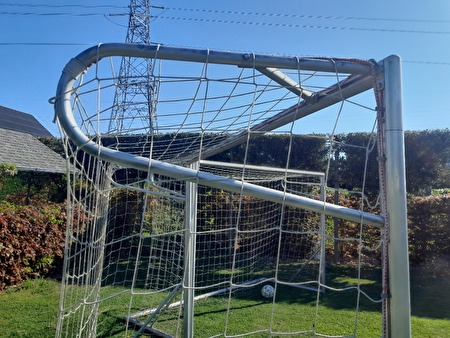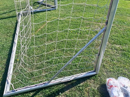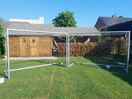 2 Aluminium voetbaldoelen van het merk Alusport type 380 demontabel met afmetingen 3,00m x 2,00m x 0,80/1,20m in zeer goede staat.Inclusief netten en nethaken met nog een nieuwe set netten en 20 nieuwe reserve nethaken.