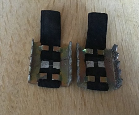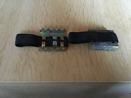 2 Metalen haken om te plaatsen onder je schoen wanneer het glad is, op gevrozen grond met rekverband, zeer interessant voor het stappen tegen het vallen in de winterEmail; jptv@telenet. be