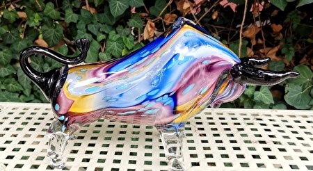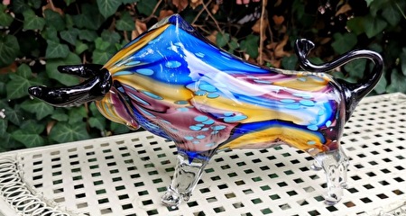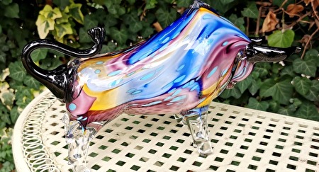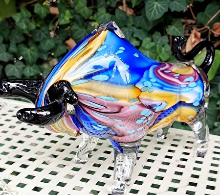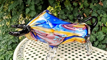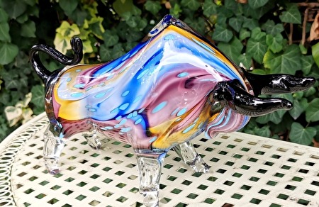Ik bied te koop aan de bijzondere Murano glazen stier die u op de foto ziet. Als waar kunstwerk kan deze stier waardevol zijn voor interieurontwerpers, verzamelaars of filmmakers. De levendige, rijke kleuren creëren een bijzondere sfeer, vooral als het licht erdoorheen schijnt: de kleuren breken, vermengen zich met elkaar en de tinten die door de vorm van de stier lopen, onthullen steeds weer nieuwe details. Het spel van licht en glas geeft het kunstwerk zijn ware artistieke kracht, die zowel dynamisch als tijdloos is.Het beeld verkeert in perfecte staat, zijn imposante verschijning domineert direct de ruimte. Afmetingen: 22 cm hoog, 12 cm breed, 38 cm lang, weegt 4 kg. 500 euro plus verzendkosten.
