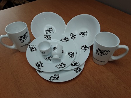 Kommen (2), tassen (2), borden (3) en eierendopjes (2)