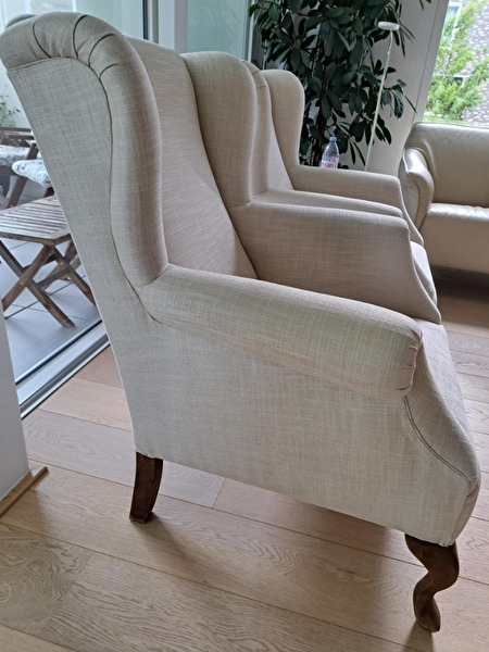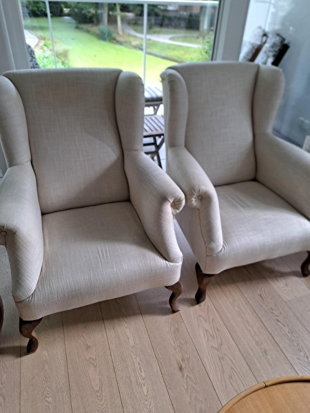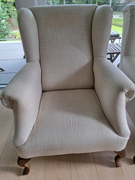 4 stoffen fauteuils, kleur beige, houten pootjes. Afmetingen: hoogte rugleuning vanaf de grond 100 cm, totale diepte 90 cm, totale breedte 81 cm, zitdiepte 52 cm, zithoogte vanaf de grond 42 cm.