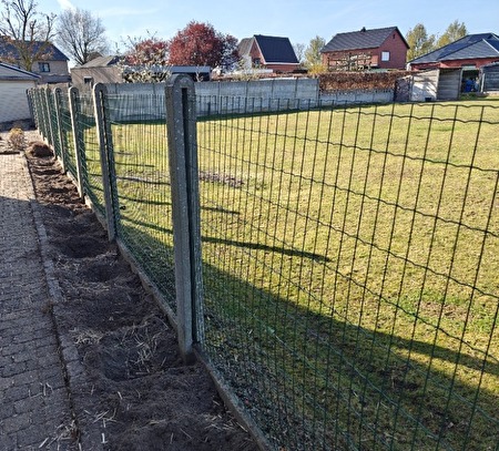 Betonnen palen (in gewone grond, NIET in beton gegoten), platen en groene draad - in totaal 32 meter