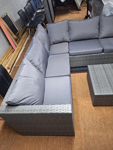 Hoek lounge set met 4 zitplaatsen en bijbehorend tafeltje. Alles voorzien met de zit- en rugkussens.