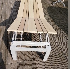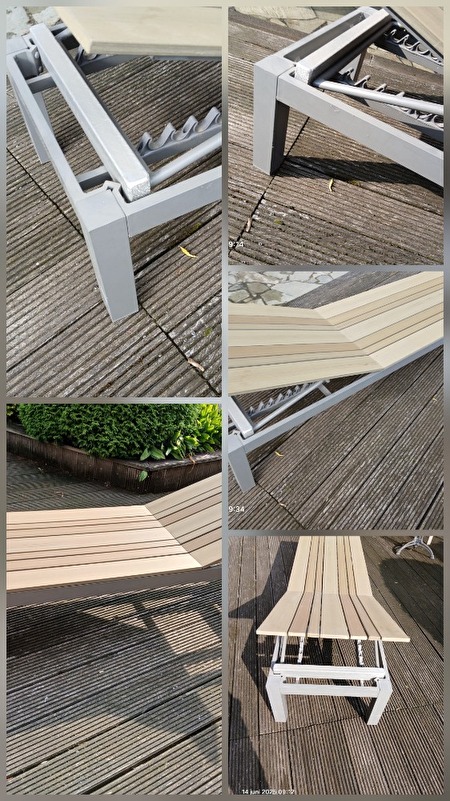 Mooi zeer sterk tuin ligbed 190cm lang .60 cm breed. Lighoogte 40cm, hoofdsteun verstelbaar tot 74 cm.Onverslijtbaar,onderstel soort alluminuim en sterke poten 6 cm op 6 cm,boven gedeelte soort kunstof ,dus zeer weerbestendig.