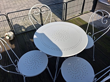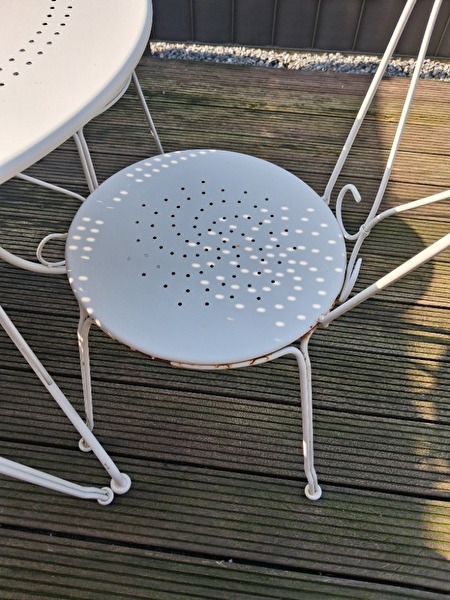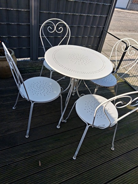 Wit robd tafeltje met 4 witte stoelen. Er is wat roest aan