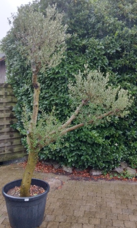 Mooie pon pon olijfboom van ongeveer 2,4m hoog. Deze staat in een grote kuip maar kan ook perfect in de volle grond geplant worden.