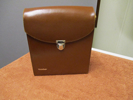 Originele Vintage lederen draagtas voor opberging van draagbaar dicteerapparaat,van het zéér bekende merk "Dictaphone International".Vermoedelijke periode +/-anno 1960-1965.Gezien zijn leeftijd,nog in mooie gebruikte staat met kleine gebruikssporen.Buitenkant is intact,enkel de velouren binnenbekleding draagt sporen van opberging.Voorzien van originele draagriem.Afmetingen:Breedte x Hoogte x Diepte = +/- 22 cm x 27 cm x 8 cm.