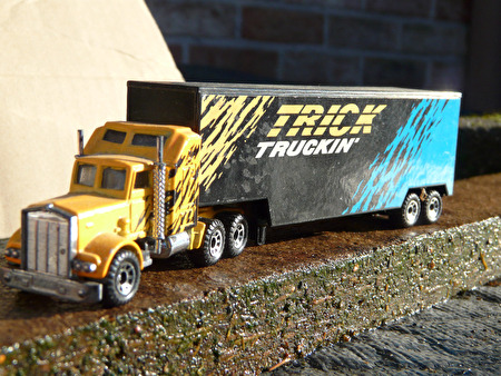 Matchbox 4 trucks met trailer , stoffig van op zolder. Geen of heel minieme lakschade- Trick Truckin' : nog in goede staat