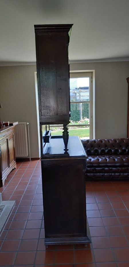 Afmetingen hoogte 225 cm breedte 125 cm diepte onderste gedeelte 48 cm , bovenste deel met glazen deurtjes is +- 25 cm