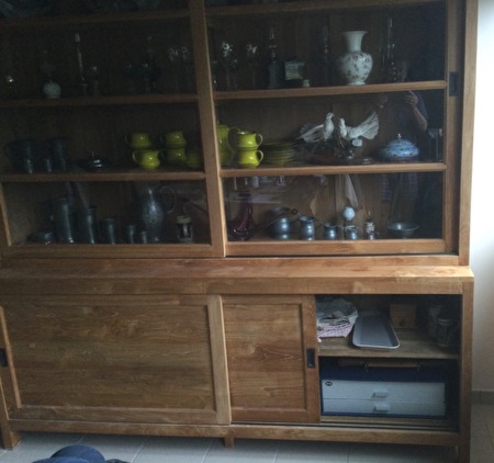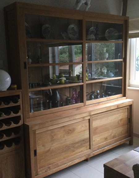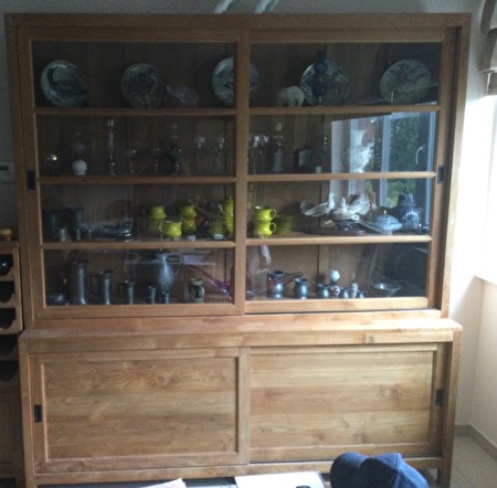 Vitrinekast in teakhout 200x220h . Te koop leeg zonder inhoud