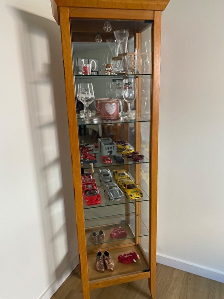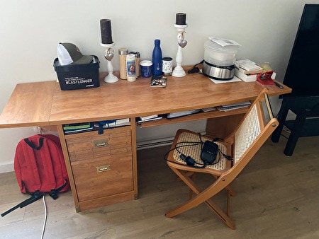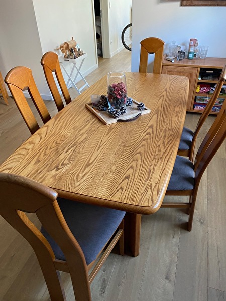 Eettafel met 6 stoelen, bureau met stoel, vitrinekast en klein kastje