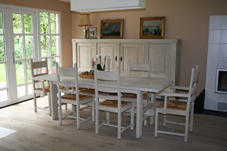 Bestaande uit tafel 2,5m lang met 6 stoelen en 2 armstoelen.