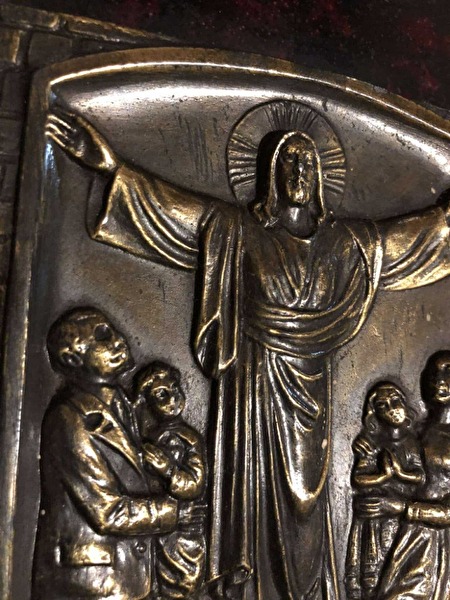 Een koperen reliëfplaquette in bronskleur , bevestigd op de plaat.