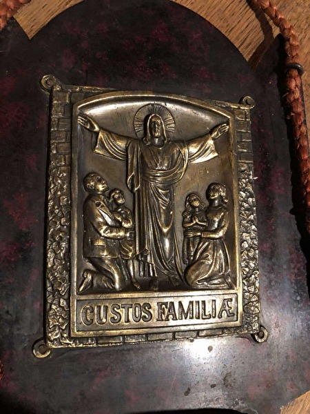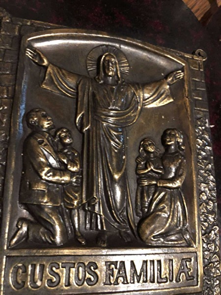 Onder de afbeelding staat de Latijnse tekst: "CUSTOS FAMILIA", wat letterlijk "Beschermer van de Familie" of "Wachter van de Familie" betekent.
