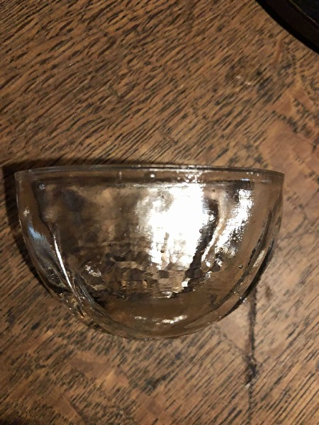 Onderaan een glazen bakje of kom (het wijwaterreservoir) op een koperen houder, versierd met een engelenkopje of cherubijn met vleugels.